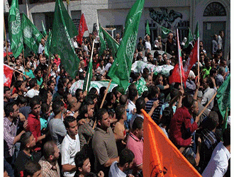 Mourners carry the bodies ofPalestinians Amer Abu Eisha and Marwan Qawasmeh, after they were killedduring an Israeli sec...